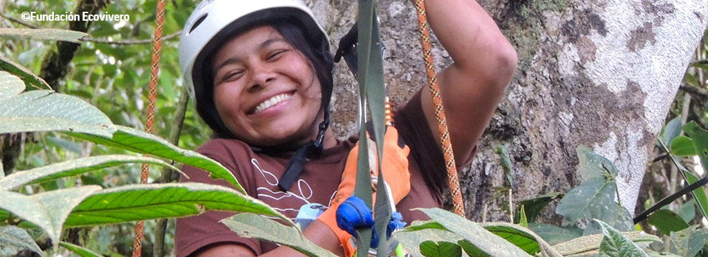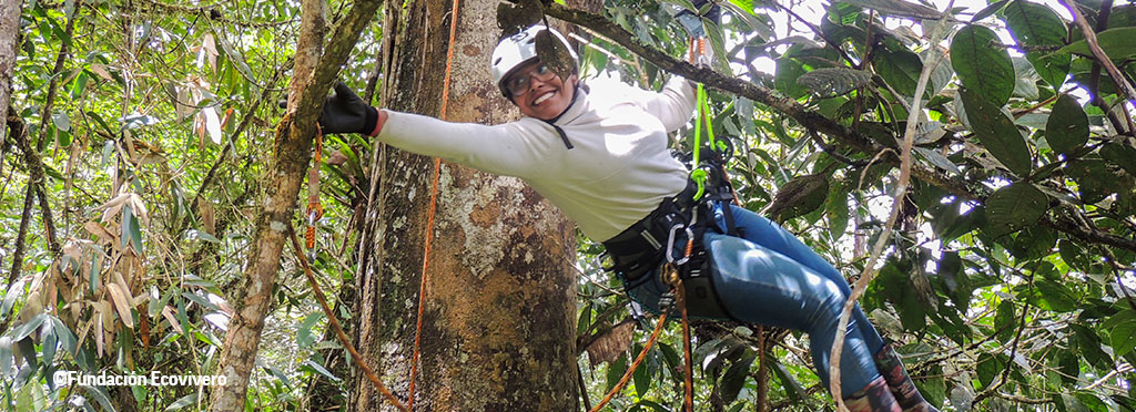 Cuatro mujeres jóvenes de la comunidad del KBA Bosque San Antonio/Km 18 fueron capacitadas y certificadas en trabajo seguro en altura y técnicas de ascenso a árboles para investigación biológica. Hoy, con arnés y cuerda, escalan los troncos de estos gigantes y alcanzan las copas, donde descubren flores, frutos y semillas que alimentan micro ecosistemas enteros de especies.